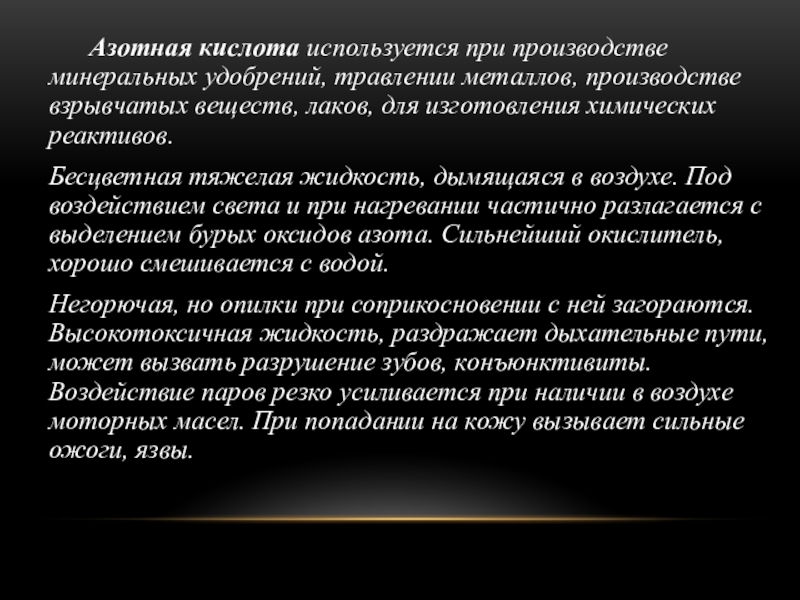 Азотная кислота используется при производстве минеральных удобрений, травлении металлов, производстве взрывчатых