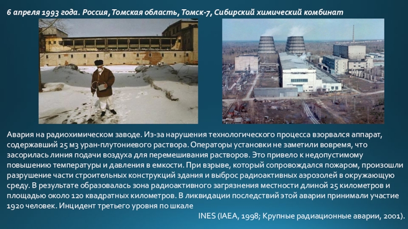 6 апреля 1993 года. Россия, Томская область, Томск-7, Сибирский химический комбинат     Авария на радиохимическом заводе.