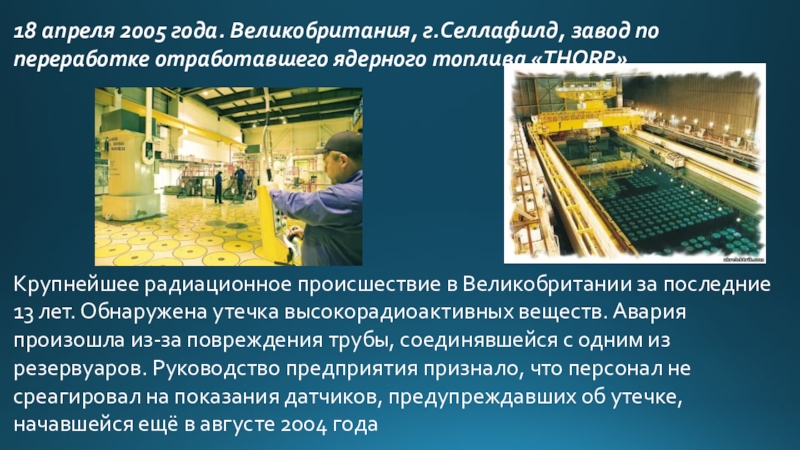 Крупнейшее радиационное происшествие в Великобритании за последние 13 лет. Обнаружена утечка высокорадиоактивных веществ. Авария произошла из-за повреждения трубы, соединявшейся с одним из резервуаров. Руководство предприятия признало, что персонал не среагировал на показания датчиков, предупреждавших об утечке, начавшейся ещё в августе 2004 года