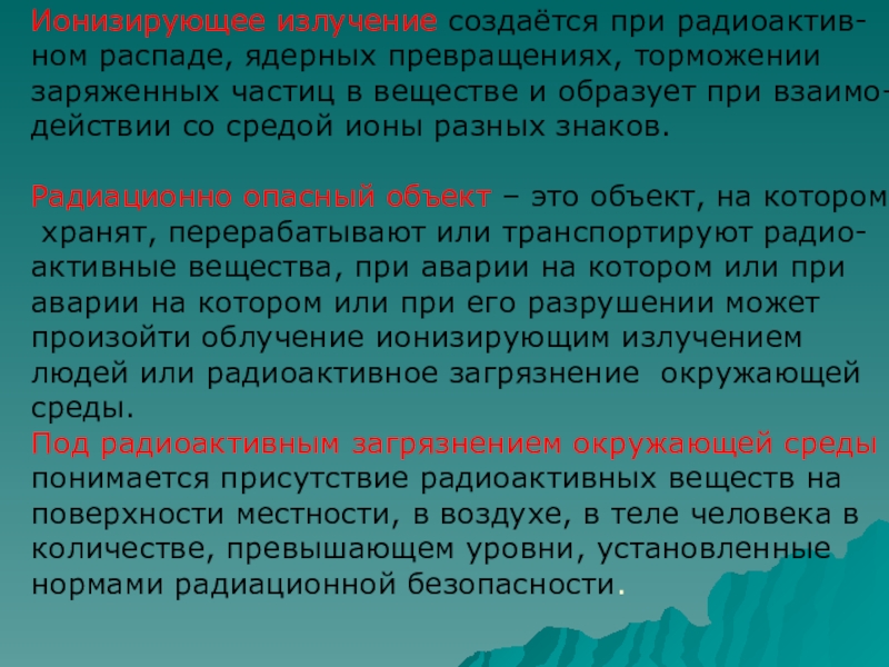 Ионизирующее излучение создаётся при радиоактив-ном распаде, ядерных превращениях, торможении заряженных частиц в веществе и образует при взаимо-действии