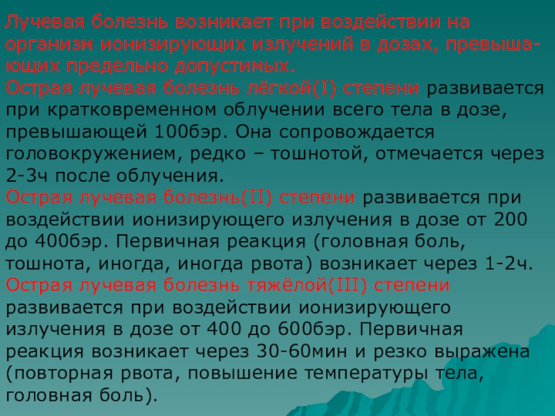 Острая лучевая болезнь лёгкой(I) степени развивается при кратковременном облучении всего тела в дозе, превышающей 100бэр. Она сопровождается головокружением, редко – тошнотой, отмечается через 2-3ч после облучения.