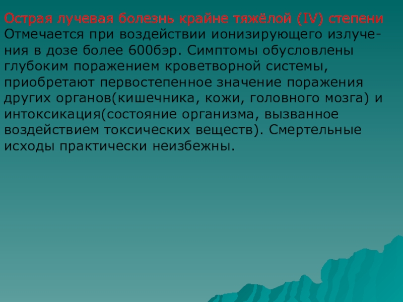 Острая лучевая болезнь крайне тяжёлой (IV) степениОтмечается при воздействии ионизирующего излуче-ния в дозе более 600бэр. Симптомы обусловлены