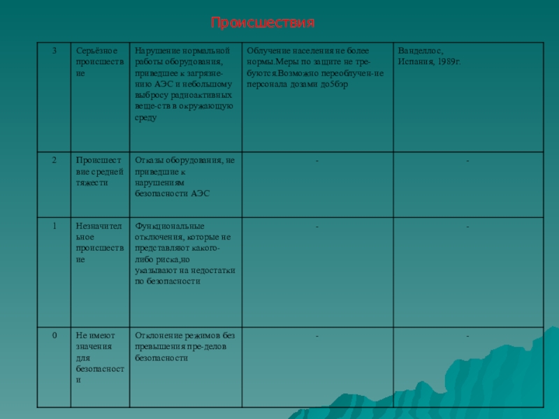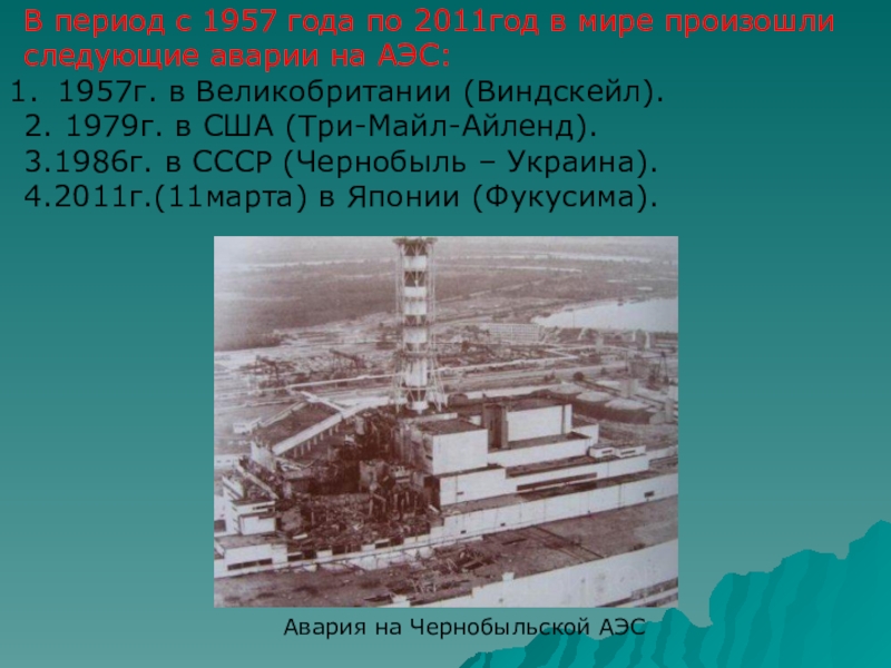 В период с 1957 года по 2011год в мире произошли следующие аварии на АЭС:1957г. в Великобритании (Виндскейл).2.