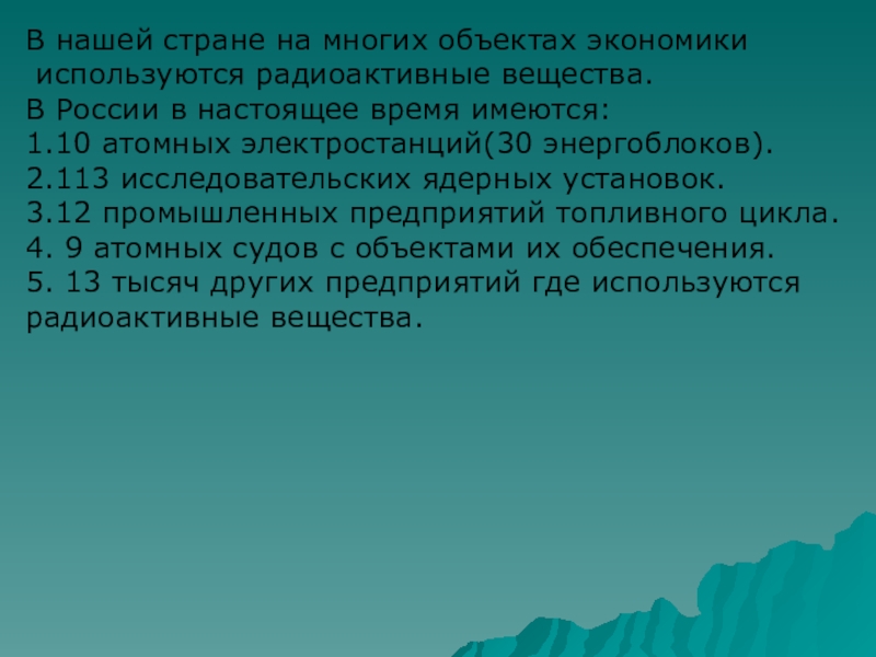 В нашей стране на многих объектах экономики используются радиоактивные вещества.В России в настоящее время имеются:1.10 атомных электростанций(30 энергоблоков).2.113 исследовательских ядерных установок.3.12 промышленных предприятий топливного цикла.4. 9 атомных судов с объектами их обеспечения.5. 13 тысяч других предприятий