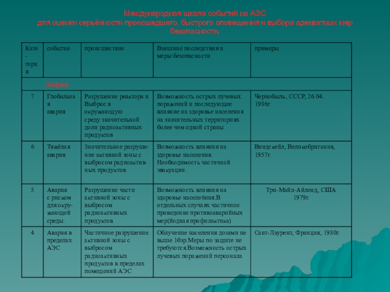 Международная шкала событий на АЭСдля оценки серьёзности происшедшего, быстрого оповещения и выбора адекватных мер безопасности.