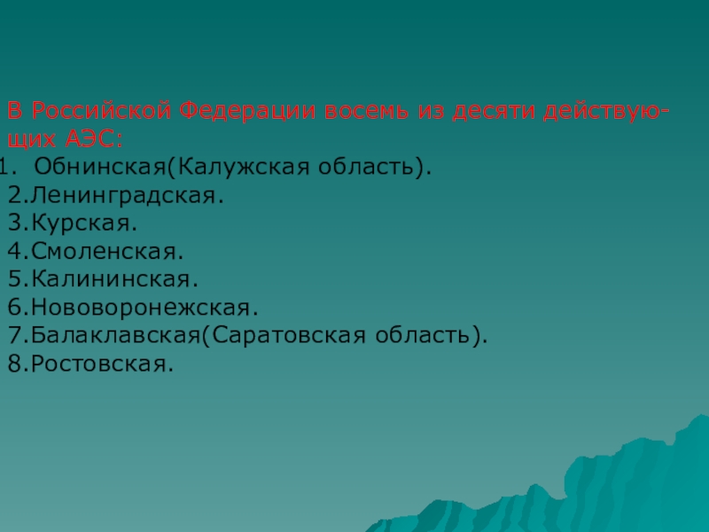 В Российской Федерации восемь из десяти действую-щих АЭС:Обнинская(Калужская область).2.Ленинградская.3.Курская.4.Смоленская.5.Калининская.6.Нововоронежская.7.Балаклавская(Саратовская область).8.Ростовская.