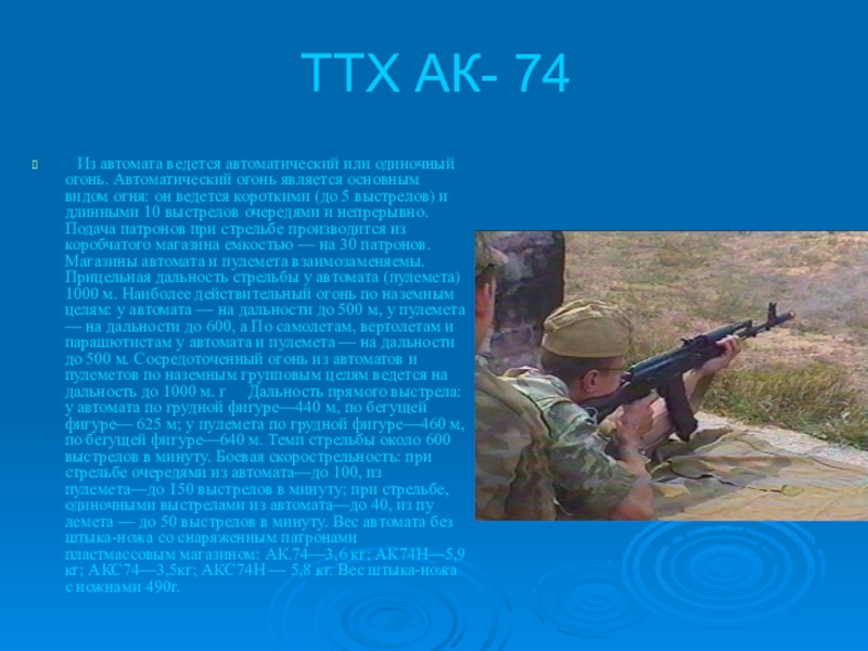 ТТХ АК- 74  Из автомата ведется автоматиче­ский или одиночный огонь. Автоматический огонь является основным