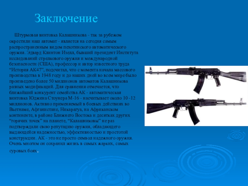 автомат - является на сегодня самым распространенным видом пехотинского автоматического оружия. Эдвард Клинтон Изелл, бывший президент Института исследований стрелкового оружия и международной безопасности (США), профессор и автор известного труда “История АК47”, подсчитал, что с момента начала массового производства в 1948 году и до наших дней во всем мире было произведено более 50 миллионов автоматов Калашникова разных модификаций. Для сравнения отмечается, что ближайший конкурент семейства АК - автоматическая винтовка Юджина Стоунера М-16 - насчитывает около 10 -12 миллионов. Активно применяемый в боевых действиях во Вьетнаме, Афганистане, Никарагуа, на Африканском континенте, в районе Ближнего Востока и десятках других “горячих точек” на планете, “Калашниковы” не раз подтверждали свою репутацию оружия, обладающего выдающейся надежностью, эффективностью и простотой конструкции. АК - это не просто символ надежного оружия. Очень многим он сохранил жизнь в самых жарких, самых суровых боях.