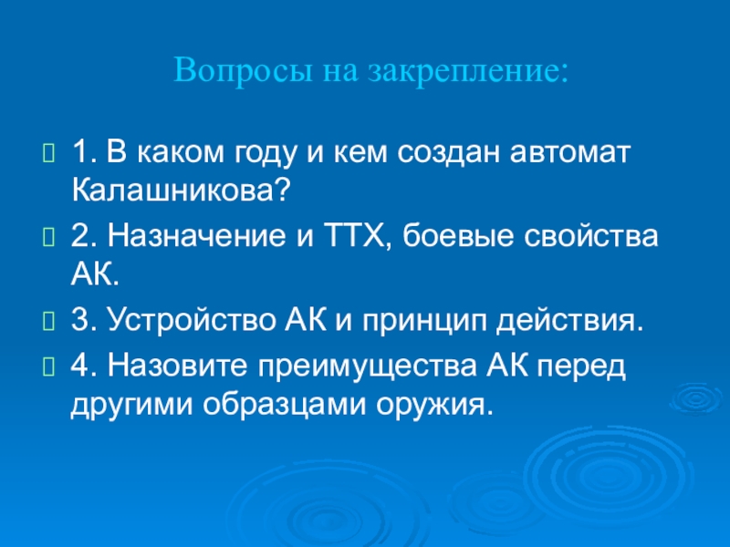 Вопросы на закрепление:1. В каком году и кем создан автомат  Калашникова?2. Назначение и ТТХ, боевые свойства