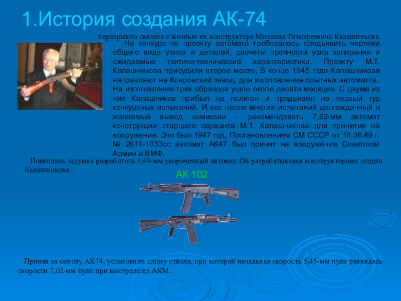 История создания АК-74 На конкурс по проекту автомата требовалось предъявить чертежи общего вида узлов и деталей, расчеты прочности узла запирания и ожидаемые тактико-технические характеристики. Проекту М.Т. Калашникова присудили второе место, В конце 1945 года Калашникова