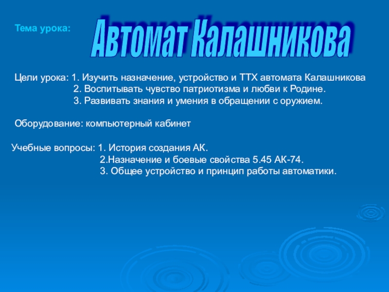 Автомат Калашникова Тема урока:Цели урока: 1. Изучить назначение, устройство и ТТХ автомата Калашникова