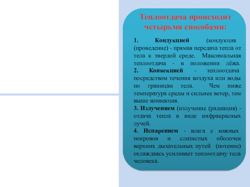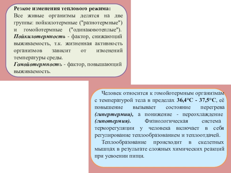 Человек относится к гомойотермным организмам с температурой тела в пределах 36,4°С - 37,5°С, её повышение вызывает состояние перегрева (гипертермии), а понижение - переохлаждение (гипотермия). Физиологическая система терморегуляции у человека включает в себя регулирование теплообразованием и теплоотдачей.