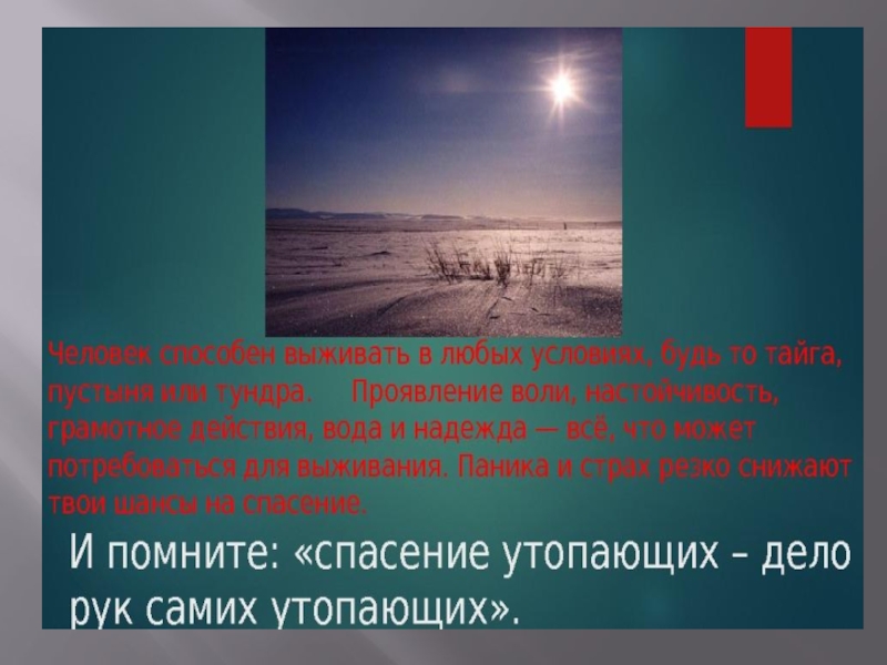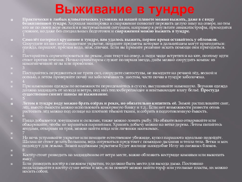 Практически в любых климатических условиях на нашей планете можно выжить, даже в с виду безжизненной тундре. Хорошая экипировка и снаряжение позволит пережить целую зиму на севере, но тем кто не по своей воле оказался в экстремальной ситуации, например в результате авиакатастрофы, приходится сложнее, но даже без специальных подготовок и снаряжения можно выжить в тундре.