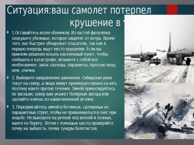 Самолёт потерпел крушение в тундре, вам удалось выжить, первое время оставайтесь у обломков. Соорудите из них ветрозащитное укрытие, поищите предметы которые в дальнейшем могут пригодиться: одежда, парашют, пресная вода, нож, спички. Если вы примите решение искать помощи они пригодиться.