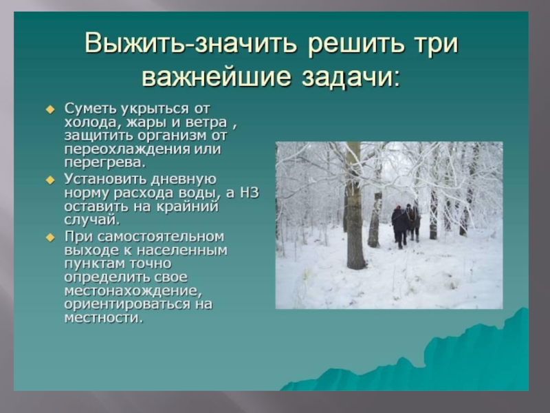 Постарайтесь сориентироваться по рекам , они текут на север, а люди чаще встретятся на юге, поэтому идти стоит против течения. Ночью ориентиром служит полярная звезда, днём можно соорудить компас из намагниченной иглы или проволоки.
