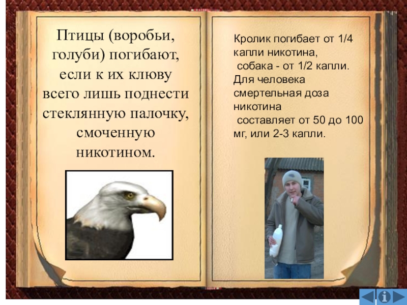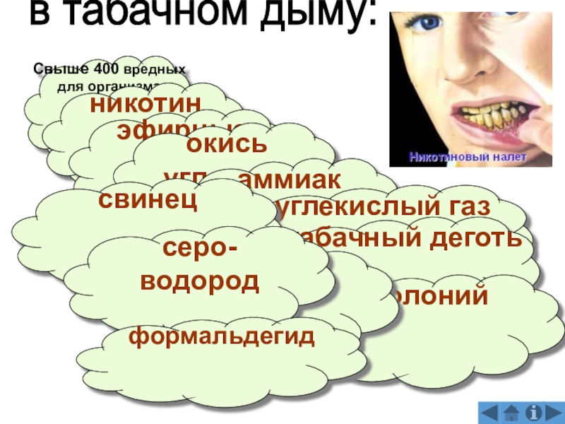 Никотин – желтоватая жидкость жгучего вкуса, растворимая в воде и жирах, хорошо всасывается слизистыми оболочками и даже кожей. Очень ядовит: смертельная доза – 1мг/кг массы тела.