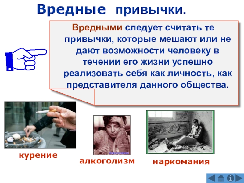 Вредными следует считать те привычки, которые мешают или не дают возможности человеку в течении его жизни успешно реализовать себя как личность, как представителя данного общества.