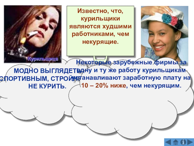 Некоторые зарубежные фирмы за одну и ту же работу курильщикам устанавливают заработную плату на 10 – 20% ниже, чем некурящим.