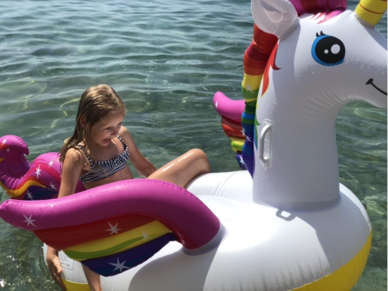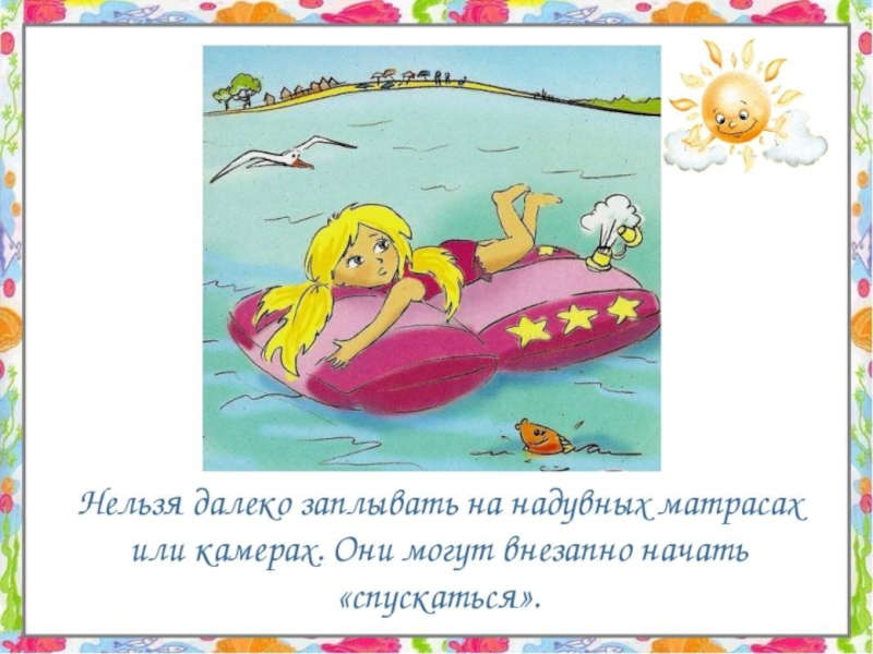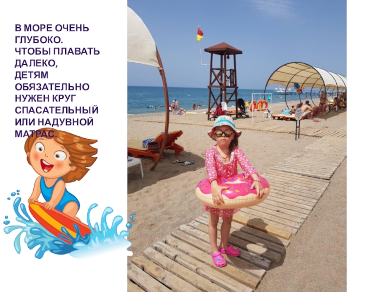 В море очень глубоко.  Чтобы плавать далеко,  Детям обязательно  Нужен круг спасательный  Или надувной матрас.