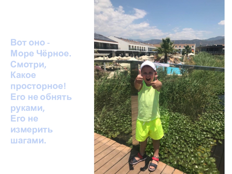 Слайд 29Вот оно - Море Чёрное. Смотри, Какое просторное! Его не обнять руками, Его не измерить шагами.
