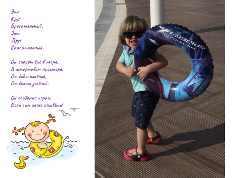 Слайд 13Это  Круг  Бросательный,  Это  Друг  Спасательный.  Он спасёт вас в море,  В штормовом просторе,  От воды солёной,  От волны зелёной.  Он