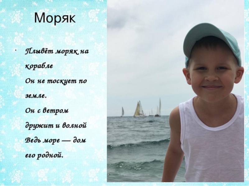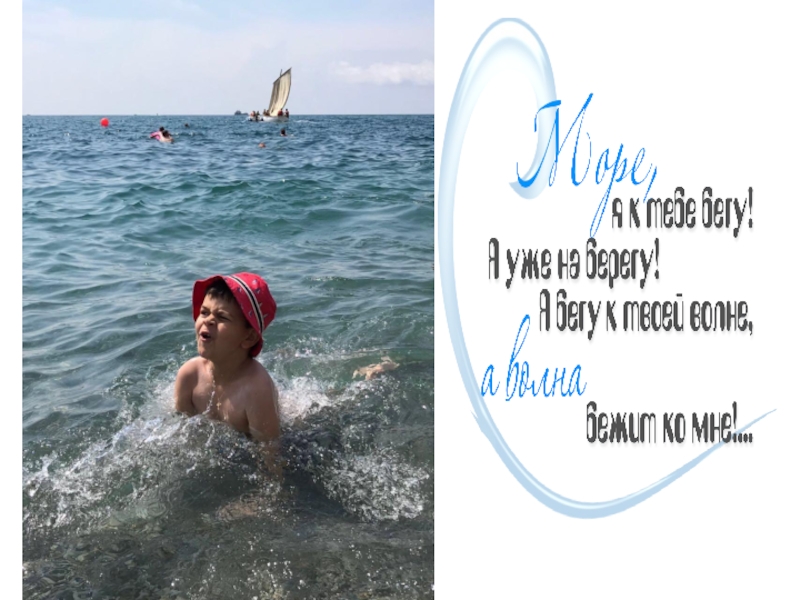 Вот оно какое море! Разноцветно-голубое Волнами шумящее, чайками кричащее, чистое, солёное, тёплое, рифлёное С небом обнимается, Солнцу