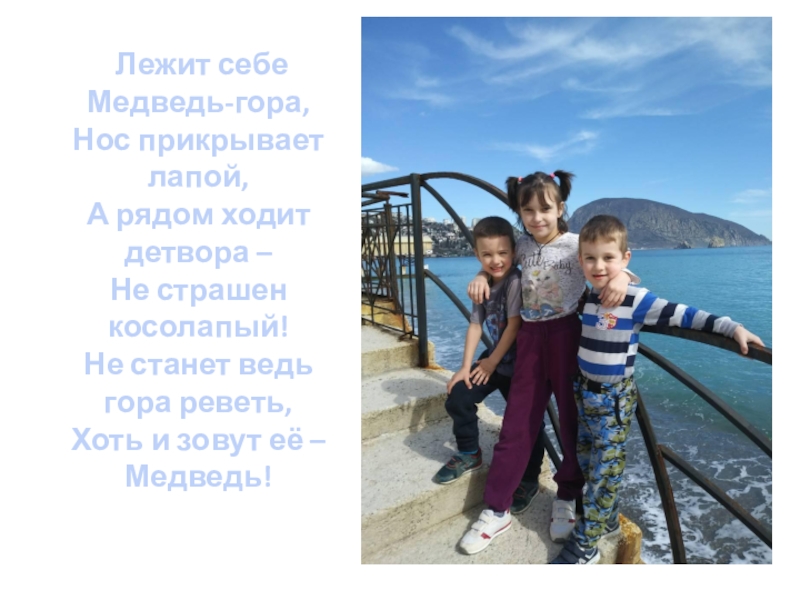 Лежит себе Медведь-гора,Нос прикрывает лапой,А рядом ходит детвора –Не страшен косолапый!Не станет ведь гора реветь,Хоть и зовут