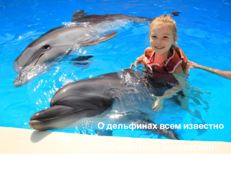 Слайд 28О дельфинах всем известно — Нет животных интересней: Острый ум, движенья ловки И легки