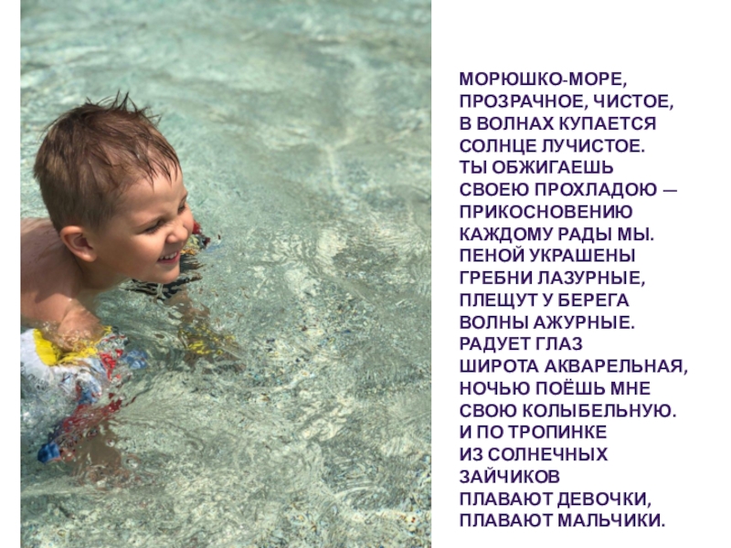 Морюшко-море,Прозрачное, чистое,В волнах купаетсяСолнце лучистое.Ты обжигаешьСвоею прохладою —ПрикосновениюКаждому рады мы.Пеной украшеныГребни лазурные,Плещут у берегаВолны ажурные.Радует глазШирота акварельная,Ночью