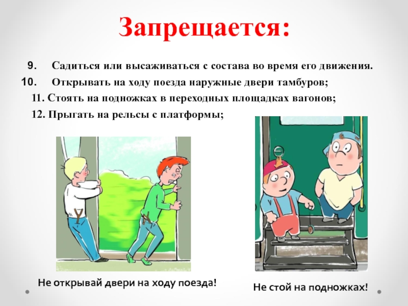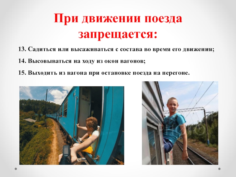 Слайд 27Садиться или высаживаться с состава во время его движения.