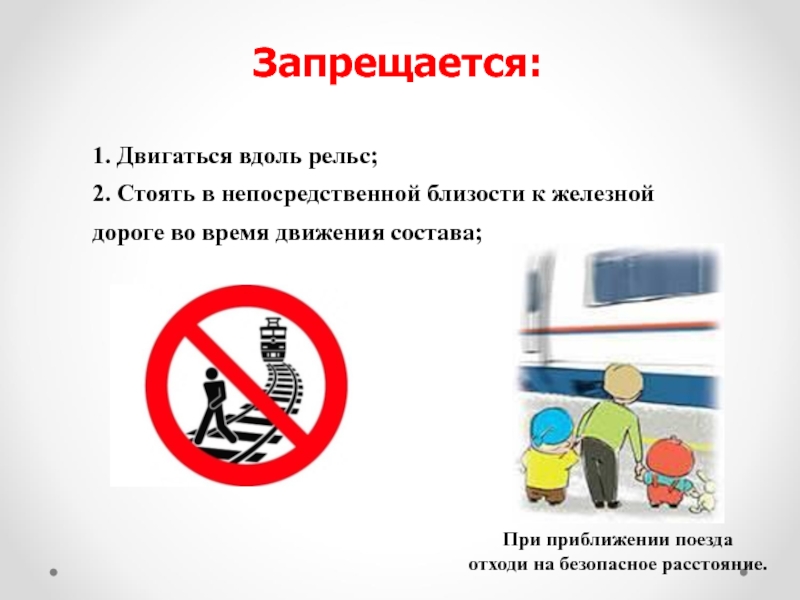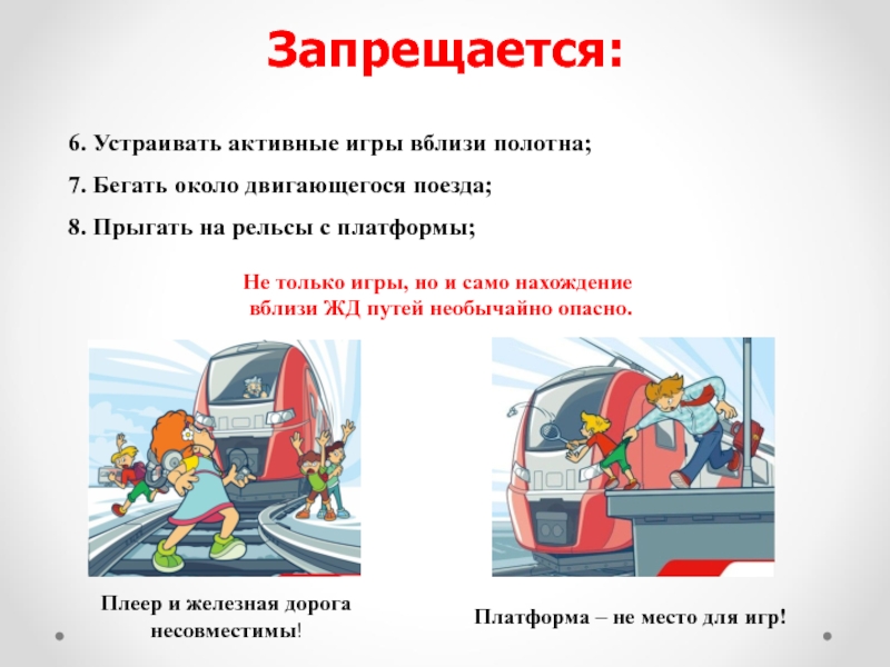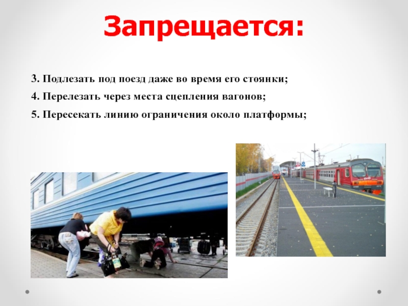 Слайд 253. Подлезать под поезд даже во время его стоянки;