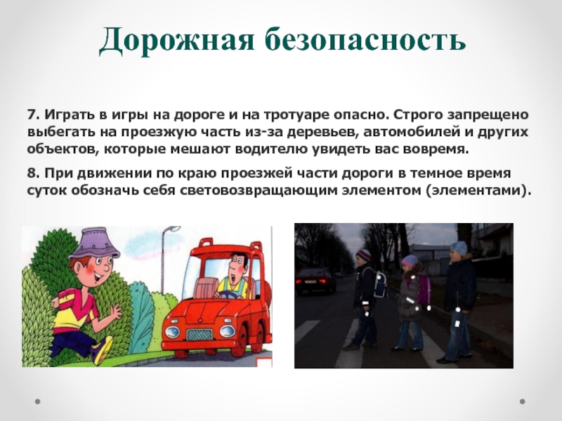 8. При движении по краю проезжей части дороги в темное время суток обозначь себя световозвращающим элементом (элементами).