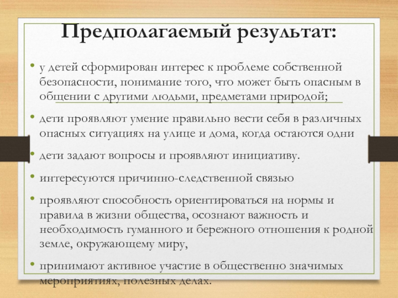 у детей сформирован интерес к проблеме собственной безопасности, понимание того,
