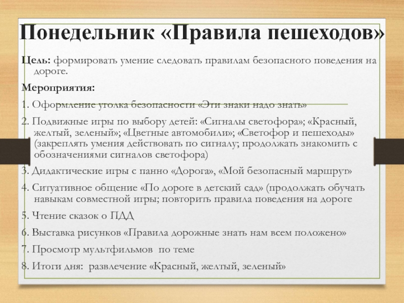 Цель: формировать умение следовать правилам безопасного поведения на дороге.