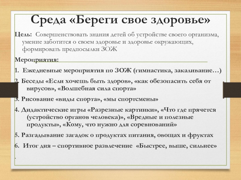 1. Ежедневные мероприятия по ЗОЖ (гимнастика, закаливание…)