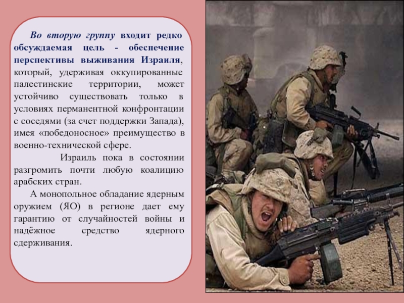 Израиля, который, удерживая оккупированные палестинские территории, может устойчиво существовать только в условиях перманентной конфронтации с соседями (за счет поддержки Запада), имея «победоносное» преимущество в военно-технической сфере.