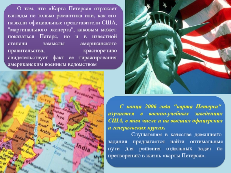 С конца 2006 года "карта Петерса" изучается в военно-учебных заведениях США, в том числе и на высших офицерских и генеральских курсах.