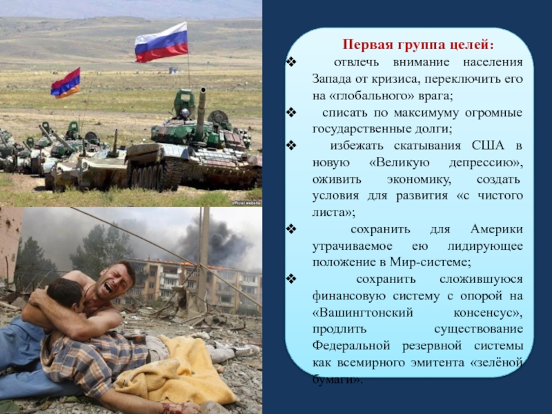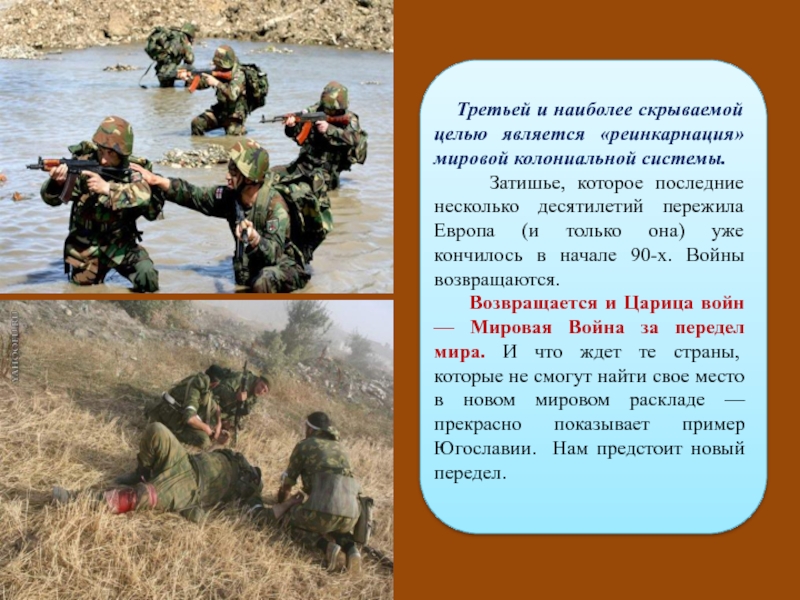 Возвращается и Царица войн — Мировая Война за передел мира. И что ждет те страны, которые не смогут найти свое место в новом мировом раскладе — прекрасно показывает пример Югославии. Нам предстоит новый передел.