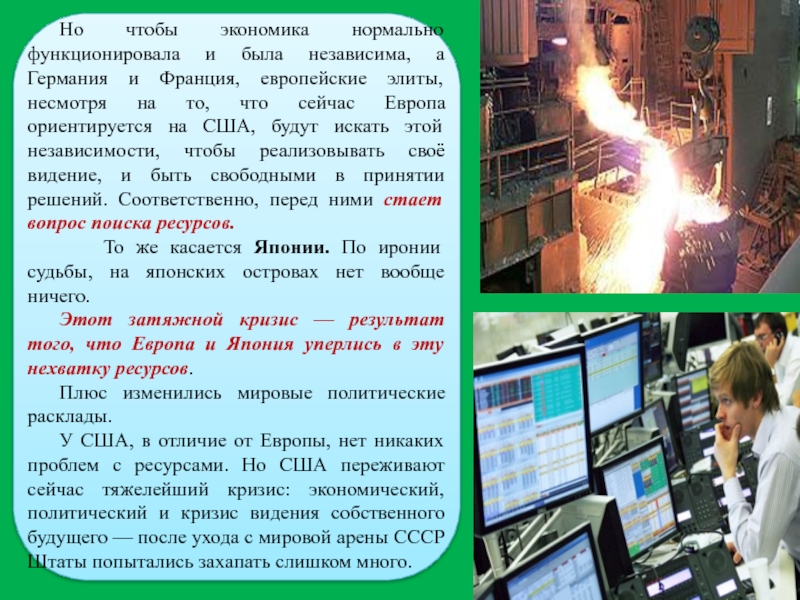 У США, в отличие от Европы, нет никаких проблем с ресурсами. Но США переживают сейчас тяжелейший кризис: экономический, политический и кризис видения собственного будущего — после ухода с мировой арены СССР Штаты попытались захапать слишком много.
