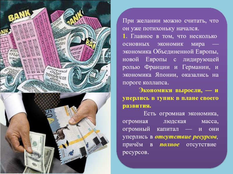 том, что несколько основных экономик мира — экономика Объединенной Европы, новой Европы с лидирующей ролью Франции и Германии, и экономика Японии, оказались на пороге коллапса.