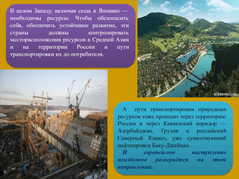 обезопасить себя, обеспечить устойчивое развитие, эти страны должны контролировать месторасположения ресурсов в Средней Азии и на территории России и пути транспортировки их до потребителя.