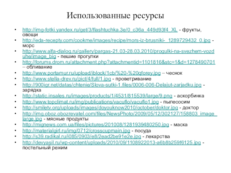 Использованные ресурсыhttp://img-fotki.yandex.ru/get/3/flashtuchka.3e/0_c36a_449d93f4_XL - фрукты, овощиhttp://eda-recepty.com/cookme/images/recipe/mors-iz-brusniki-_1289729432_0.jpg - морсhttp://www.alfa-dialog.ru/gallery/pargas-21.03-28.03.2010/progulki-na-svezhem-vozduhe/image_big - пешие прогулкиhttp://forums.drom.ru/attachment.php?attachmentid=1101816&stc=1&d=1278490701 – обливаниеhttp://www.portamur.ru/upload/iblock/1cb/%20-%20qforey.jpg – чеснокhttp://www.stella-drev.ru/pict/4/full/1.jpg - проветриваниеhttp://900igr.net/datas/chtenie/Slova-sutki-1.files/0006-006-Delajut-zarjadku.jpg -