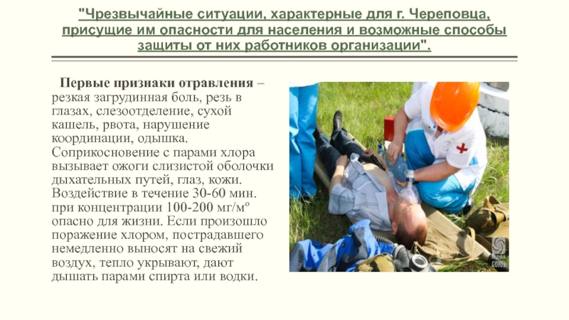 Первые признаки отравления – резкая загрудинная боль, резь в глазах, слезоотделение, сухой кашель, рвота, нарушение координации, одышка. Соприкосновение с парами хлора вызывает ожоги слизистой оболочки дыхательных путей, глаз, кожи. Воздействие в течение 30-60 мин. при концентрации 100-200 мг/мо опасно для жизни. Если произошло поражение хлором, пострадавшего немедленно выносят на свежий воздух, тепло укрывают, дают дышать парами спирта или водки.