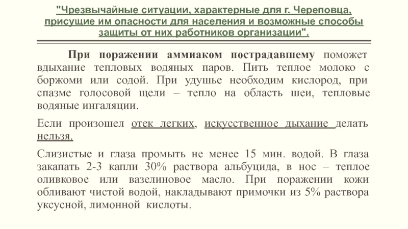 При поражении аммиаком пострадавшему поможет вдыхание тепловых водяных паров. Пить теплое молоко с боржоми или содой. При удушье необходим кислород, при спазме голосовой щели – тепло на область шеи, тепловые водяные ингаляции.