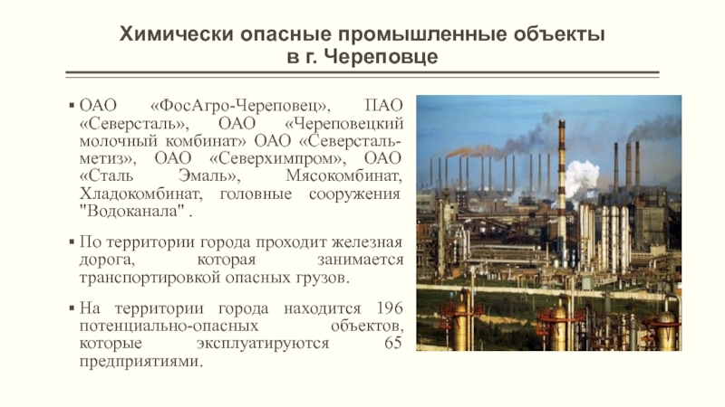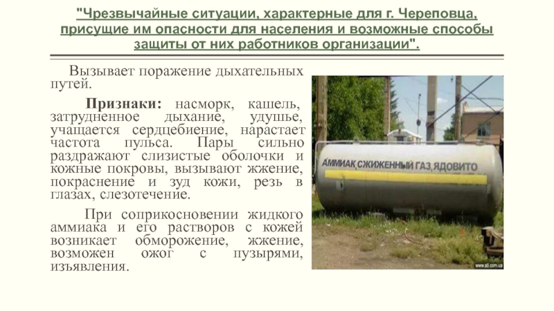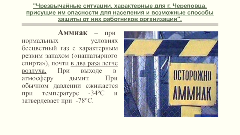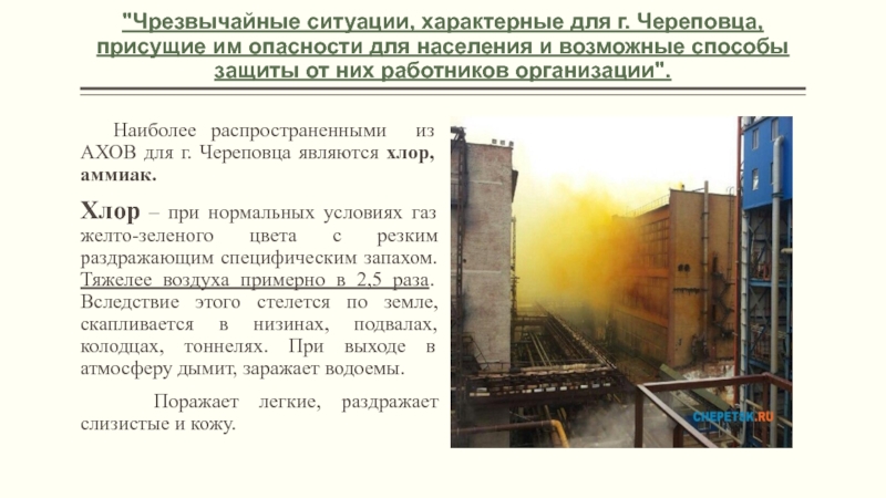 Наиболее распространенными из АХОВ для г. Череповца являются хлор, аммиак.