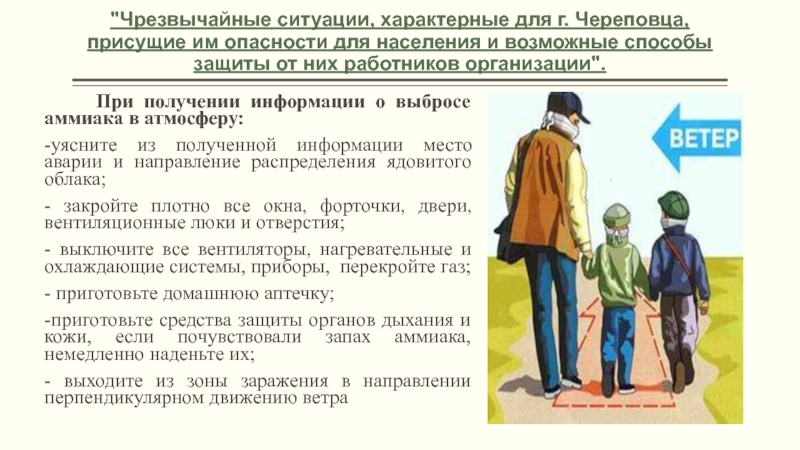 - уясните из информации место аварии и направление распространения ядовитого облака;