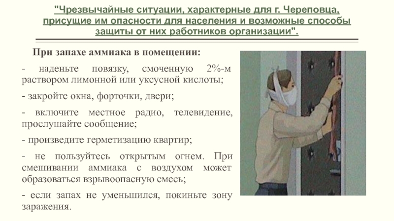 -приготовьте средства защиты органов дыхания и кожи, если почувствовали запах аммиака, немедленно наденьте их;