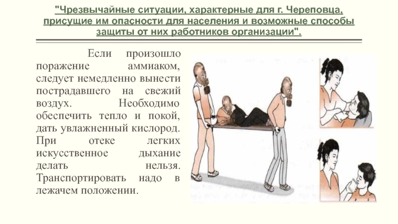 Если произошло поражение аммиаком, следует немедленно вынести пострадавшего на свежий воздух. Необходимо обеспечить тепло и покой, дать увлажненный кислород. При отеке легких искусственное дыхание делать нельзя. Транспортировать надо в лежачем положении.