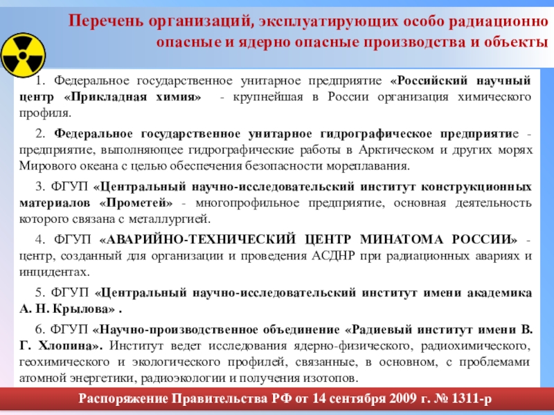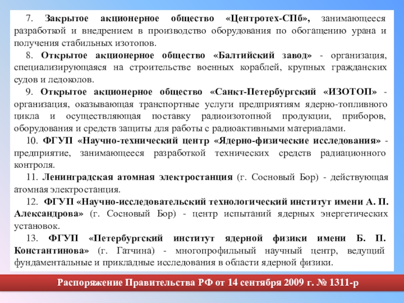 6. ФГУП «Научно-производственное объединение «Радиевый институт имени В.Г. Хлопина». Институт ведет исследования ядерно-физического, радиохимического, геохимического и экологического профилей, связанные, в основном, с проблемами атомной энергетики, радиоэкологии и получения изотопов.