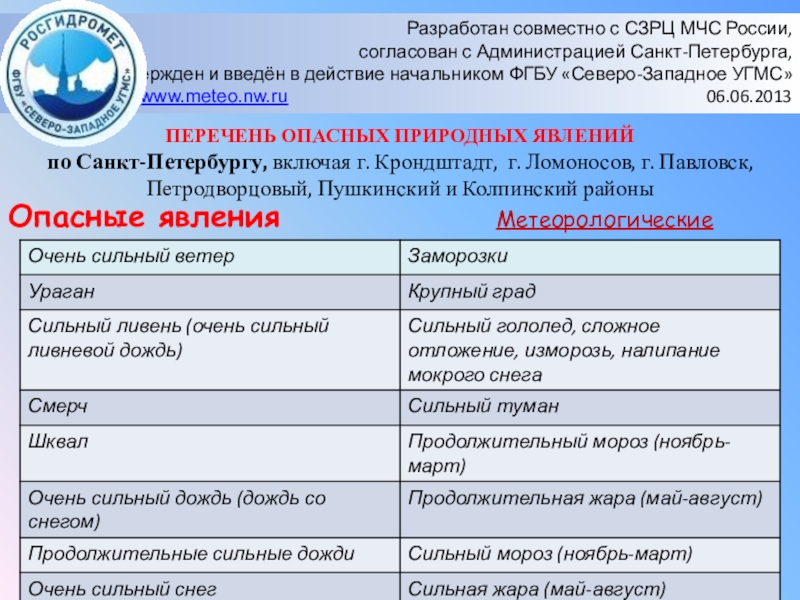 Тема : «Чрезвычайные ситуации природного и техногенного характера, присущие Санкт-Петербургу»
